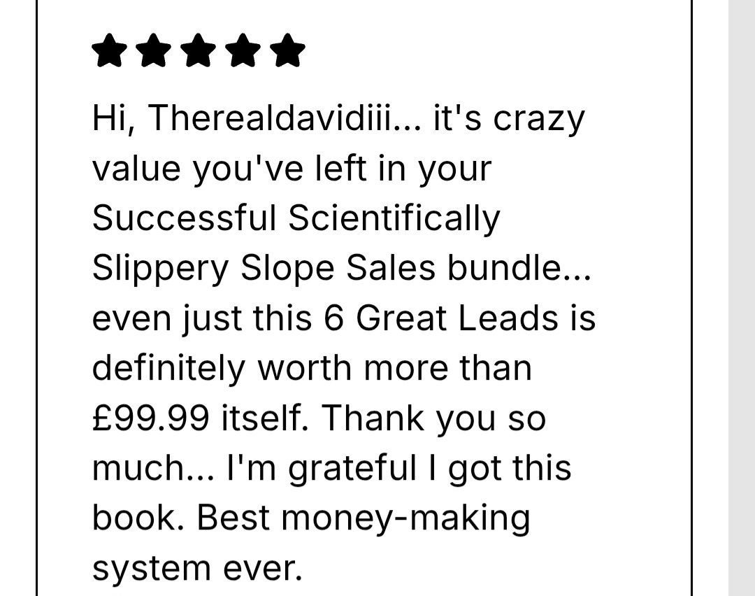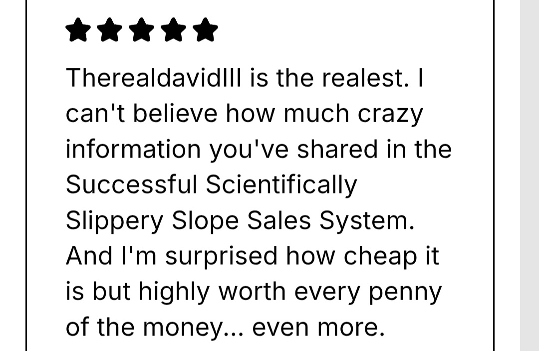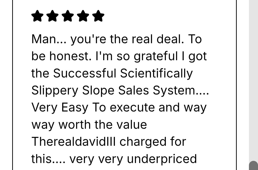 Using your writing skill or spoken words to sell any great offers, products and services is the key achieving financial, location, and time freedom to escape the 9-5 grind, permanently- and it's only attainable using the Successful Scientifically Slippery Slope Effective Communication Sales System (SSSSECSS)